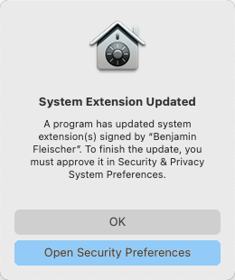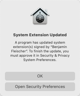 During the installation of the driver (see previous step) it is possible that the message below is displayed. To be able to install the driver (signed by ‘Benjamin Fleischer’), permission must be given in the Security & Privacy System Preferences. At this message, click the bottom button labeled Open Security Preferences.