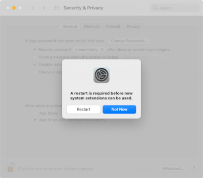 After opening the Security Preferences you will see the screen below. Click on the lock icon and enter your password to confirm. Next, click the Allow button to complete the driver update.