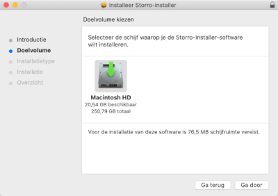 De installatiewizard leidt u door het installatieproces. Klik op ‘Ga door’ om naar de volgende stap te gaan van de installatie. Bij de derde stap klikt u op ‘Installeer’ om Storro te installeren. U zal dan gevraagd worden naar uw gebruikersnaam en wachtwoord. Wanneer u de hele installatiewizard heeft doorlopen kunt u het installatieprogramma naar de prullenmand verplaatsen.