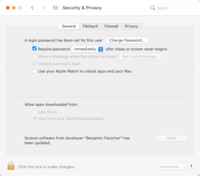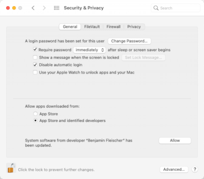 Tijdens de installatie van de driver (zie vorige stap) kan het zijn dat onderstaande melding wordt getoond. Om de driver (signed by ‘Benjamin Fleischer’) te kunnen installeren dient hiervoor toestemming te worden gegeven in de Security & Privacy System Preferences. Klik bij deze melding op de onderste knop genaamd Open Security Preferences.